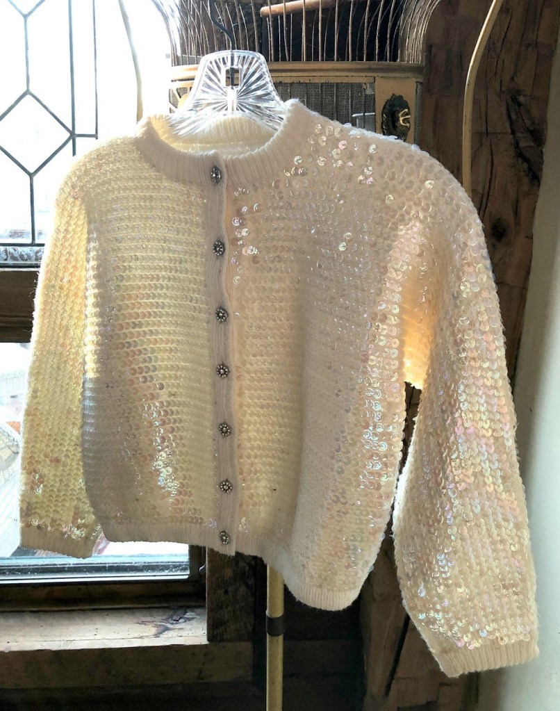 “Okay, focus Susan focus.  I know I have a light caramel shift-dress in here somewhere, that will have to do.  And my cream vintage sweater with the sequins and rhinestone buttons, that’ll look good together.